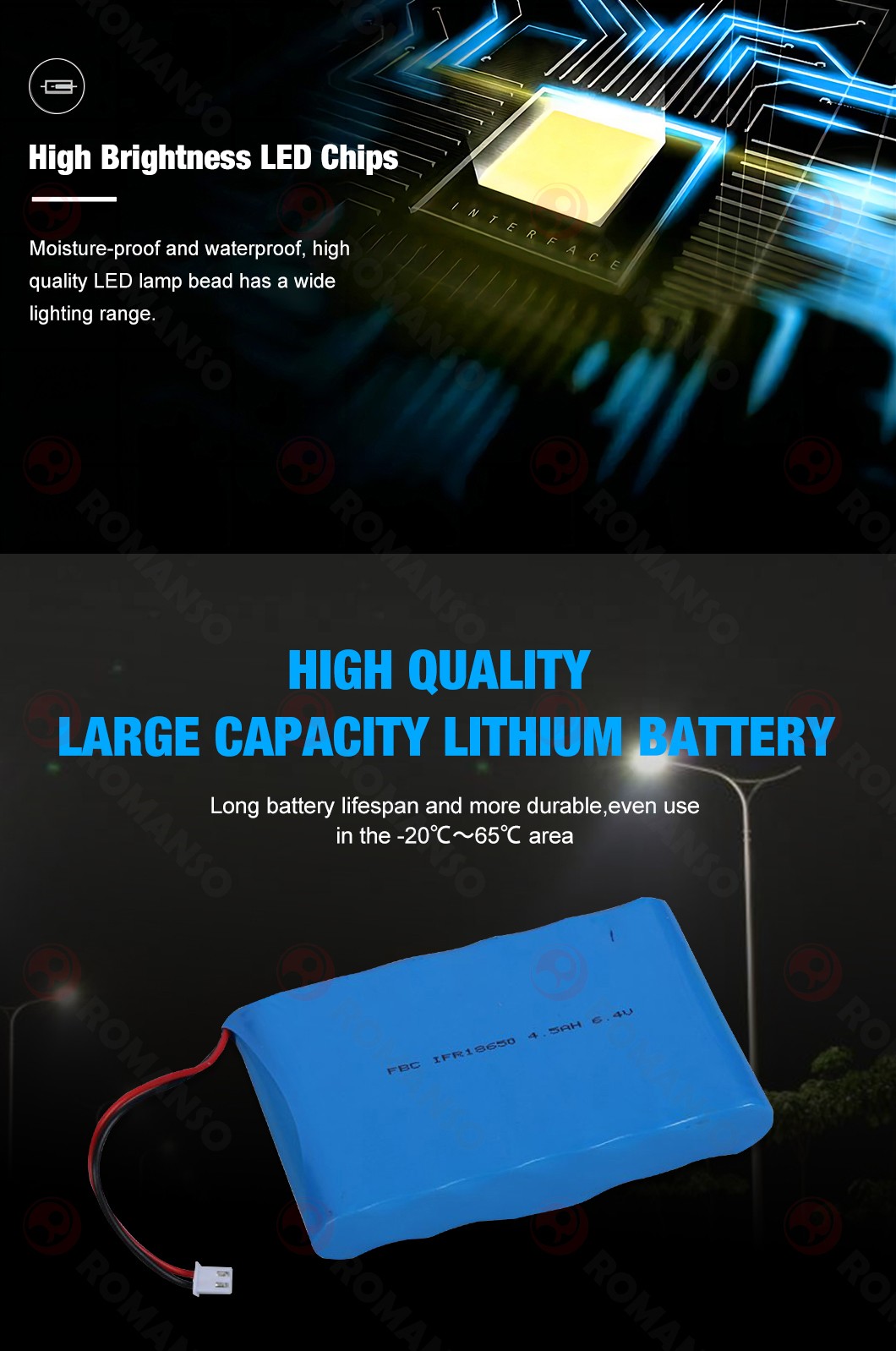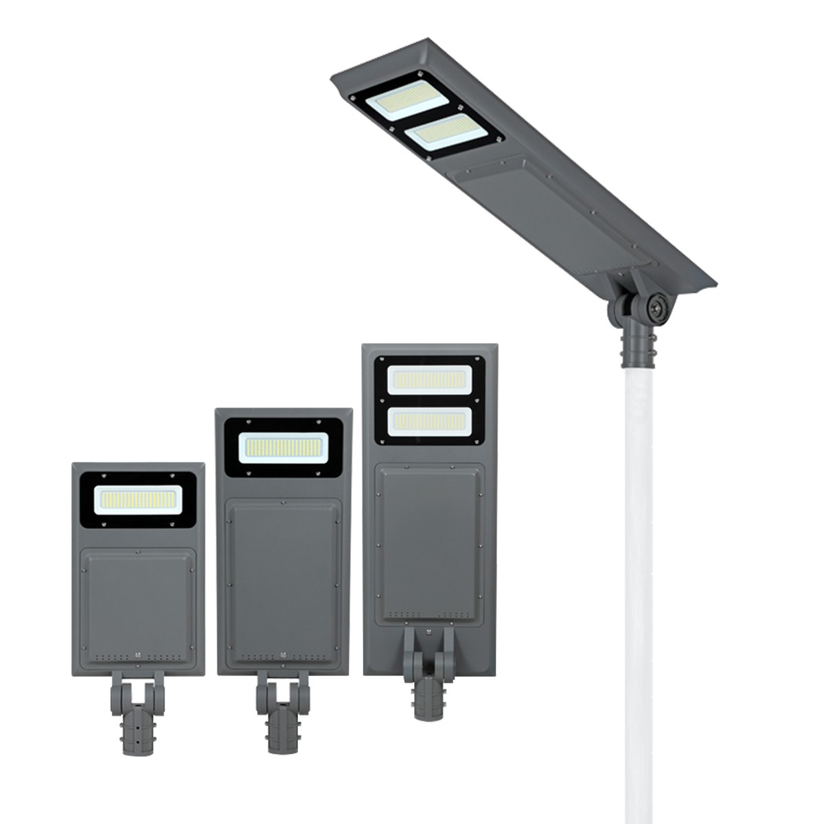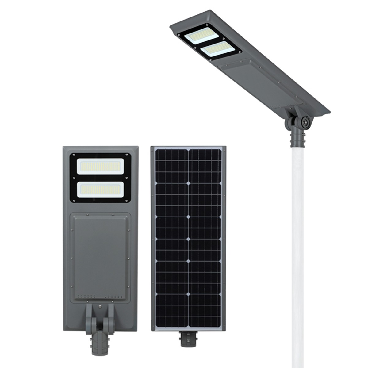 The features of this solar street light is an ALL-IN-ONE design. The light engine and battery and solar panel are built right into the LED fifixture. No need for a power source which eliminates the need for wiring and trenching
